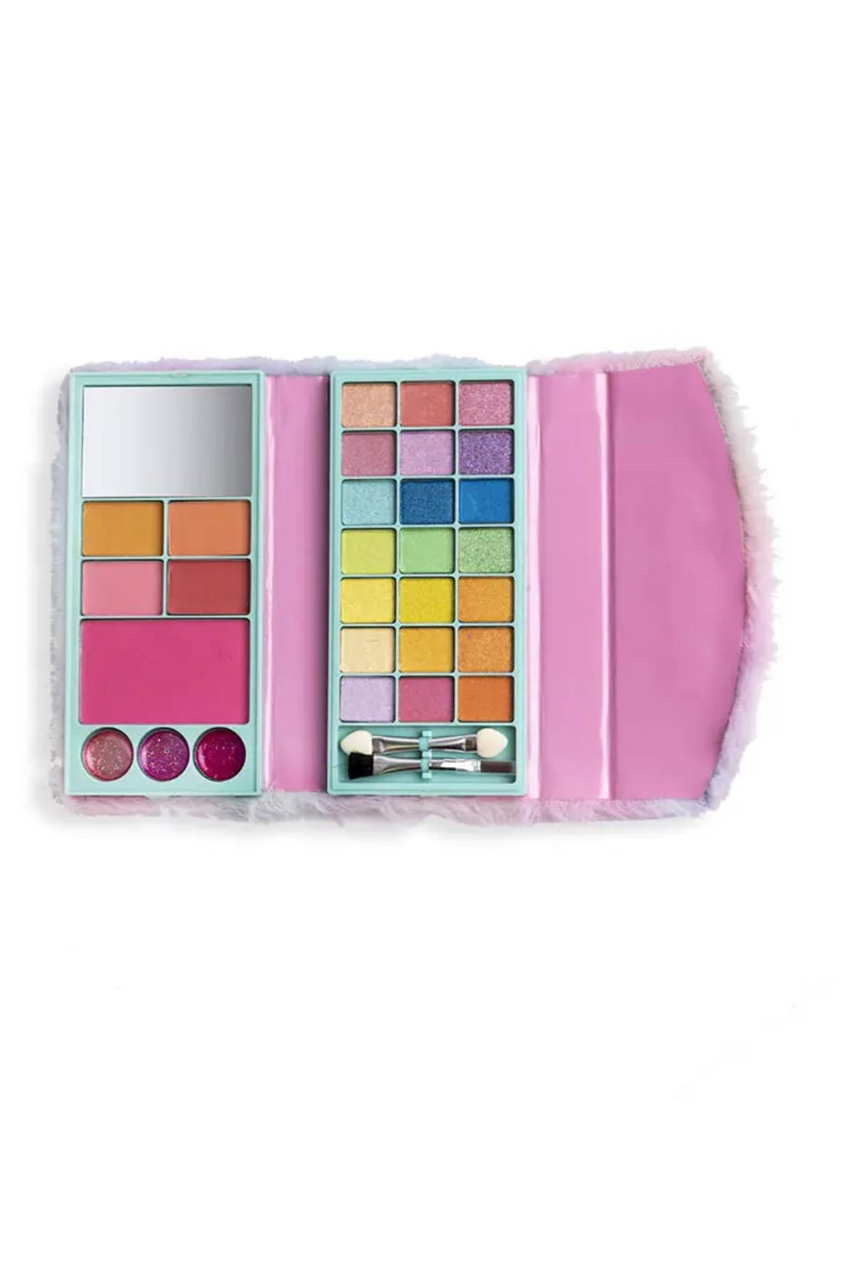 Ürün İçeriği: 21 adet göz farı, 5 adet allık ve bronzer, 3 adet dudak parlatıcısı, aplikatör, fırça