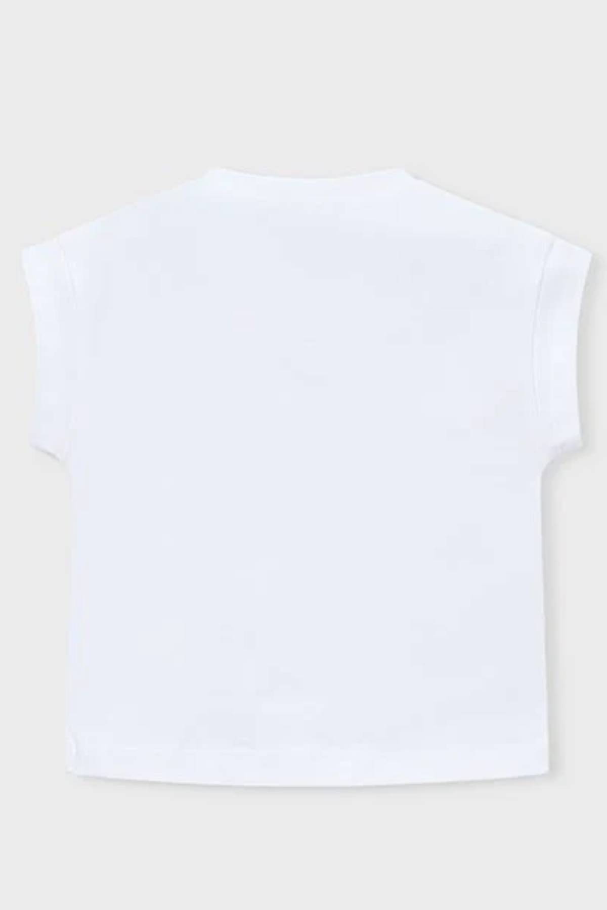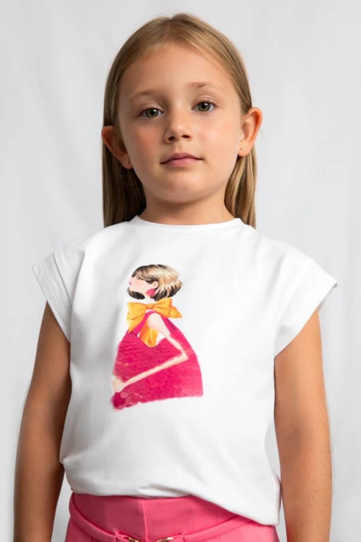 Bu sevimli beyaz tişört, kız çocuk gardırobunun temel parçalarından biridir. Yumuşak ve esnek pamuk kumaştan üretilmiş olup günlük giyimde konfor ve rahatlık sağlar.